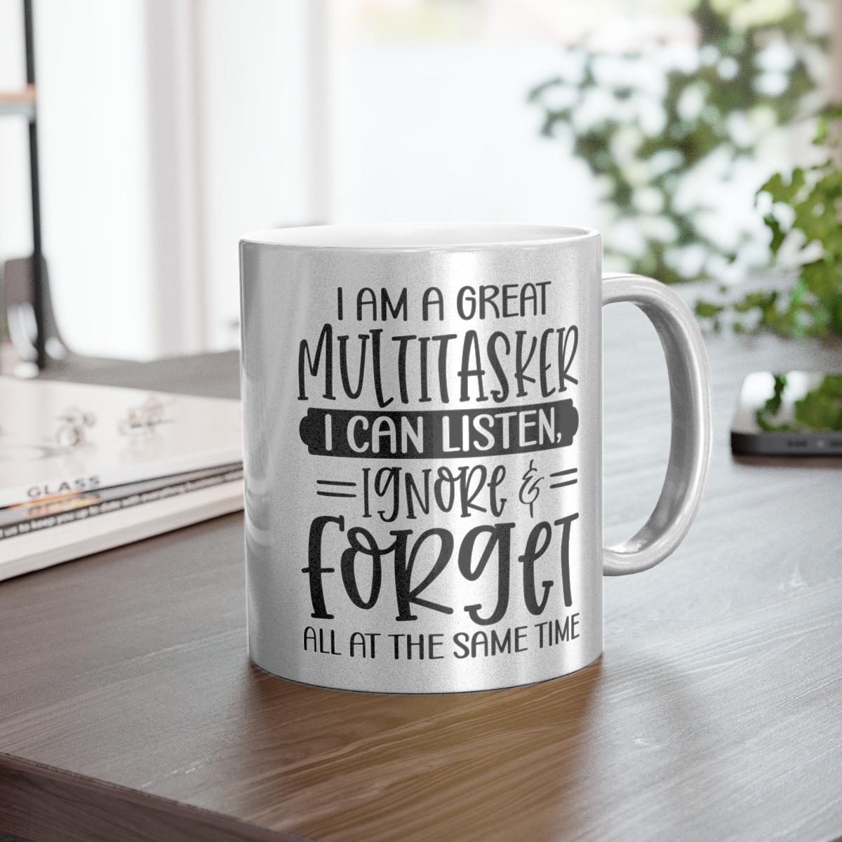 I am a great multi tasker I can Listen, ignore , forget all at the same time, sarcasm, Metallic Mug (SilverGold)